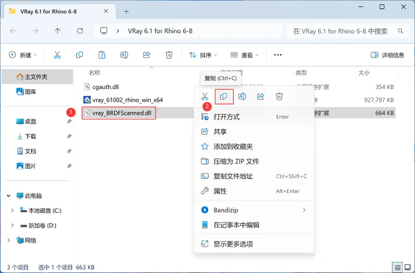 11、回到VRay 6.2 for Rhino 6-8文件夹下的Crack文件夹,找到【vray_BRDFScanned.dll】文件,右键点击【复制按钮】。