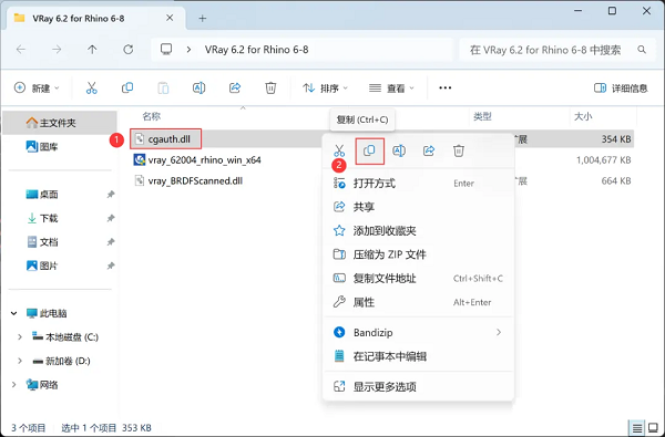 6、回到VRay 6.2 for Rhino 6-8文件夹,找到【cgauth.dll】文件,右键点击【复制按钮】。