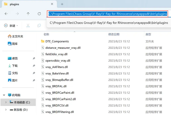12、打开路径:C:\Program Files\Chaos Group\V-Ray\ V-Ray for Rhinoceros\vrayappsdk\bin\plugins。