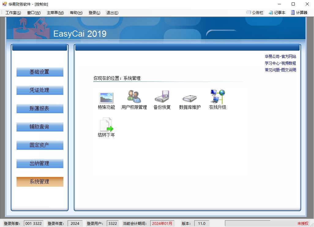 8、系统管理:特殊功能(数据修复-反结帐、反记帐、反结帐;科目拆细、凭证传输、重排凭证号)、用户权限管理、备份恢复、数据库维护。