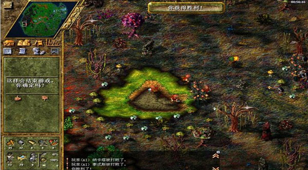 这关核心要点就是怎样防黑暗部落的法师过来抓人,特烦人的一件事每20几分钟就会随机从上下两路来人,开始自己兵不多很难搞过,而且那个抓人的法师跑的贼快赶都赶不上,我的建议就是消极防御,变2个盗贼分别放在上下2条黑暗部落来的出口那,看见哪一路来兵了,就赶快把建筑全关掉,铲地哥,锤子哥,搬运工全部减少到最小,然后全变盗贼躲起来,敌人来看见没人好几次连中间都没到就回去了,之后再全变回去,虽然很麻烦但是很有效,最多4次后就能造兵防御了,建议每5分钟保存一次,不然失误了很痛苦的,上面那条路上有16个石头开局的时候变16个盗贼拿回来,岛上的武器也拿回来,等有兵了2边都放上30以上,敌人就不会来人了,这时候只用F12即可(我超级悲催,打的时候出现bug了有一个农场不能挖掉,可苦逼了我了,但咱是个有毅力的人啊,好不容易做个攻略不能最后关头掉链子啊,我发现只有一个黑暗农场时,黑暗城堡的火小的多,园丁过去一般都能过去挖一锹至少,好吧我就造了300+园丁过去一点点磨,没石头了咱用魔法变出来,终于经过了11个多小时,在有农场的情况下仍然把黑暗城堡挖掉了