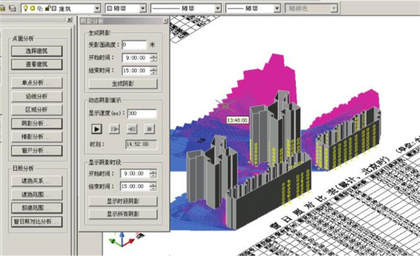 按照日照时间间隔,自动计算并绘制建筑物轮廓的连续阴影图及动态模拟阴影演示过程