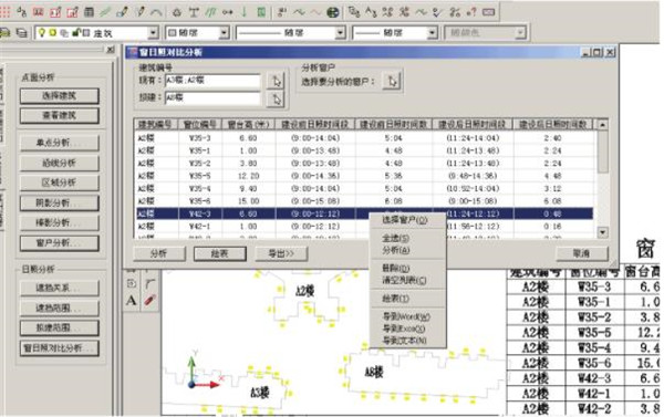 分析现有建筑上的窗户在拟建建筑建设前后的日照对比情况,分析结果自动汇总为表格