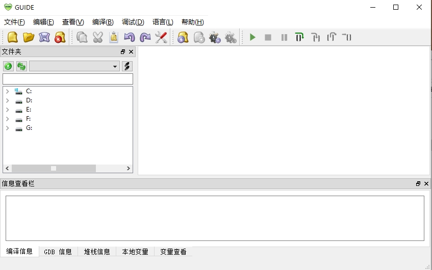 用户完成当前源文件的编译之后,点击“调试”菜单中的“开始调试”命令或使用快捷键F5,GUIDE将开始调试当前源文件生成的可执行文件,GUIDE下方的信息显示栏中“GDB信息”页、“堆栈信息”页、“本地变量”页、“变量查看”页将分别显示调试器的反馈信息、堆栈信息、本地变量的值、用户指定查看的变量值。