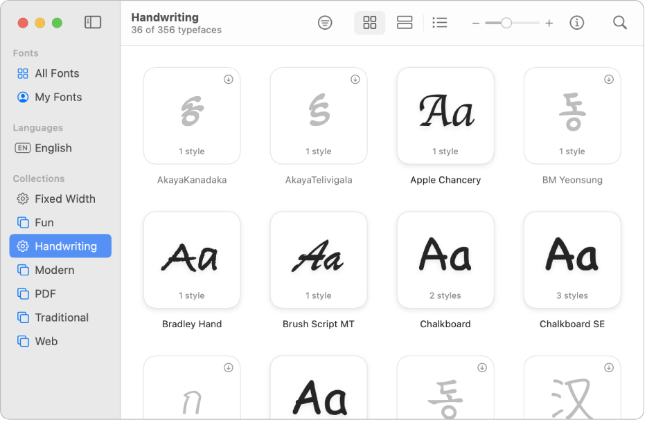 若要在 MAC 中使用字体,你需要使用“字体册”安装字体。当你在安装字体时,“字体册”会列出它找到的任何问题,供你检查。你也可以稍后再验证字体。