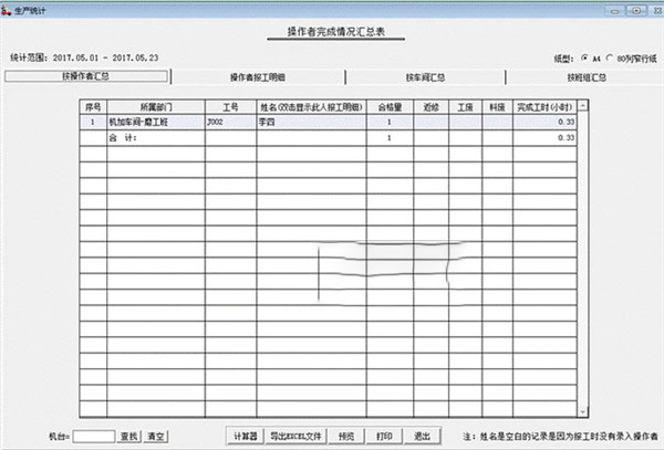 在显示操作者和机台汇总表的同时可显示操作者及各机台的报工明细,以便于进行核对,还能显示按车间、班组汇总的情况,并提供导出Excel文件的功能。