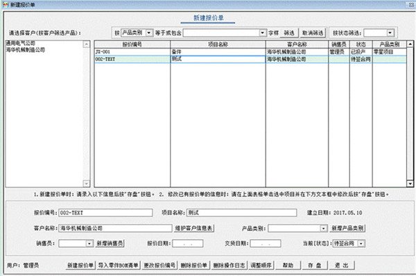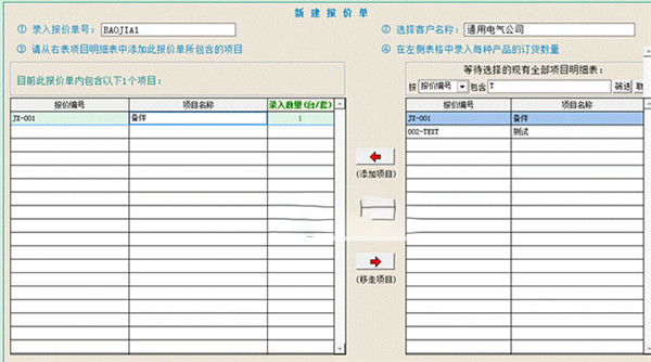 3.多项目报价:报价前需“新建报价单号”,首先录入报价单号,再选择客户名称,之后添加待报价的项目(可以是一个也可以是任意多个项目),这里说的项目就是已建立好的单个报价单: