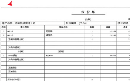 4、解决产品准确报价问题:产品报价速度比手工提升10倍以上,准确率得到大幅提升。由手工估价改为电脑快速精确计算。手工估价随意性很大, 在正式结算之前赔赚不知道。使用本软件后可有据可依, 每做一批产品前, 成本多少? 利润多少? 都一目了然, 彻底解决随意报价问题。 由于市场原材料、加工费经常变动,本软件会自动按您维护好的最新价格进行报价,解决了您重复报价时的烦恼。具备历史报价查询功能。 报价单可导出与打印报表样式相同的EXCEL文件, 同时导出字段可根据需要自由选择。