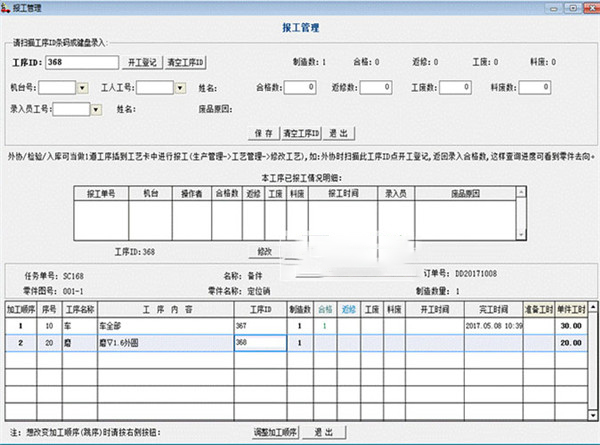 第五步:生产报工(当零件完工时扫描工序ID条码后,录入机台/操作者/合格数/不合格数)->进度查询(查询零件每道工序的开工/完工时间、目前停留在哪道工序、已完成多少件,剩余多少件)。