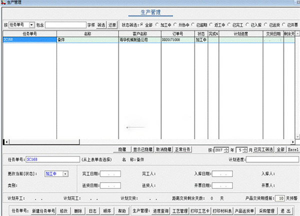 5、解决了生产过程的管控和工序预警问题:本软件以极小的维护量解决了生产管理中的加工进度监控及查询:零件加工停留在哪道工序、什么原因停工、完成了多少及剩余多少工作量,都可以随时在生产任务汇总表(生产台帐)中得到答案,为合理安排生产提供最权威的依据,同时对生产工序、外购件采购有提前预警功能, 使生产管理事半功倍。