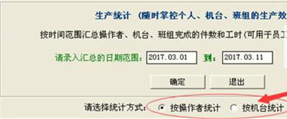 第六步:生产统计:可按时间段统计机台、操作者、车间、班组完成的件数及工时。
