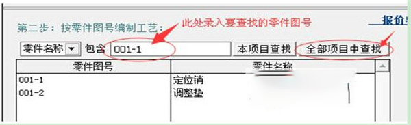 第二步:报价单建立好后,单击主界面的:[工艺管理]按钮,在报价单明细表中单击选择该报价单并录入新的零件图号后按[工艺录入]钮,依次为所有零件编制工艺卡。