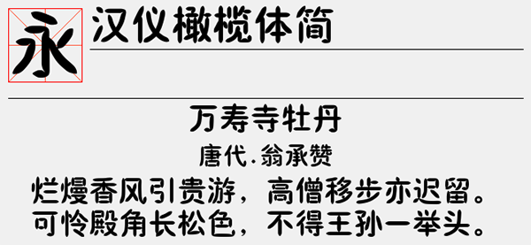 汉仪橄榄体简字体是一款非常有个性的中文简体字体,字如其名,字形以橄榄为原型,两头尖尖,中间饱满圆润,具有简约明快的特色。字形修长,笔画具有粗细变化,简约干练,清新醒目。适合应用于艺术设计、平面宣传设计、网页设计、文本装潢、信息展示、篆刻制模英文、数据制作、装潢设计、视觉设计、字帖等一切合法应用场景,有喜欢的朋友可免费下载收藏。