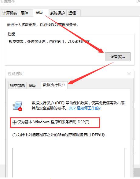 1. 请确保电脑的数据执行保护为关闭状态: win键+R键调出“运行”对话框,输入sysdm.cpl→确定→高级→第一个设置按钮→数据执行保护,选中“仅为基本windows程序和服务启用DEP”确定,重启电脑。