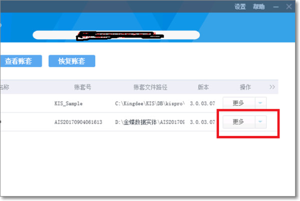 2、双击登陆以后,会出现账套的管理界面,点击需要备份的账套名称后面的更多图标。