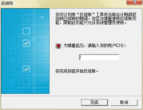 1、打开软件后,直接同时按快捷键Ctrl+F12,随后弹出反结账界面,如果没有设置口令,直接点击“完成”即可,设置了口令的话需要输入口令,否则无法继续。温馨提示,如果Ctrl+F12被系统占用请尝试同时按住Ctrl+Fn+F12,优先选择仍然是Ctrl+F12。