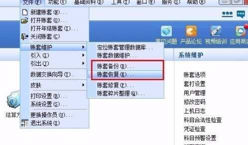 7、账套的备份与恢复,在文件下拉框下找到帐套维护进入选择账套备份或账套恢复