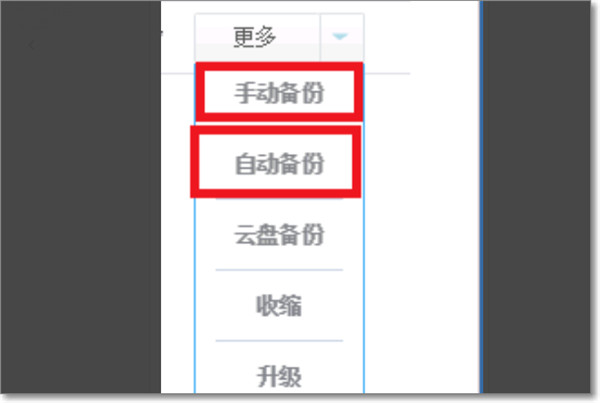 3、点击后会出现多个选项,可以看到备份账套有手动备份、自动备份和云盘备份。