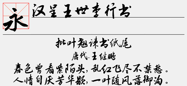 汉呈王世李行书字体是一款很优秀好用的行书中文书法字体,其字体设计师在传统行书字体上进行了艺术创新,笔画看上去有点粗,字形非常的行云流水,书写看上去很流畅,整体效果非常不错。并且字形拥有笔触纤细、书写流畅、字型洒脱等特色,可为大家带来很好的视觉感。可以很好的应用于文本装潢、信息展示、网页设计、篆刻制模、数据制作、装潢设计、计算艺术设计、视觉设计、字帖等一切合法应用场景,有喜欢的朋友可免费下载收藏。