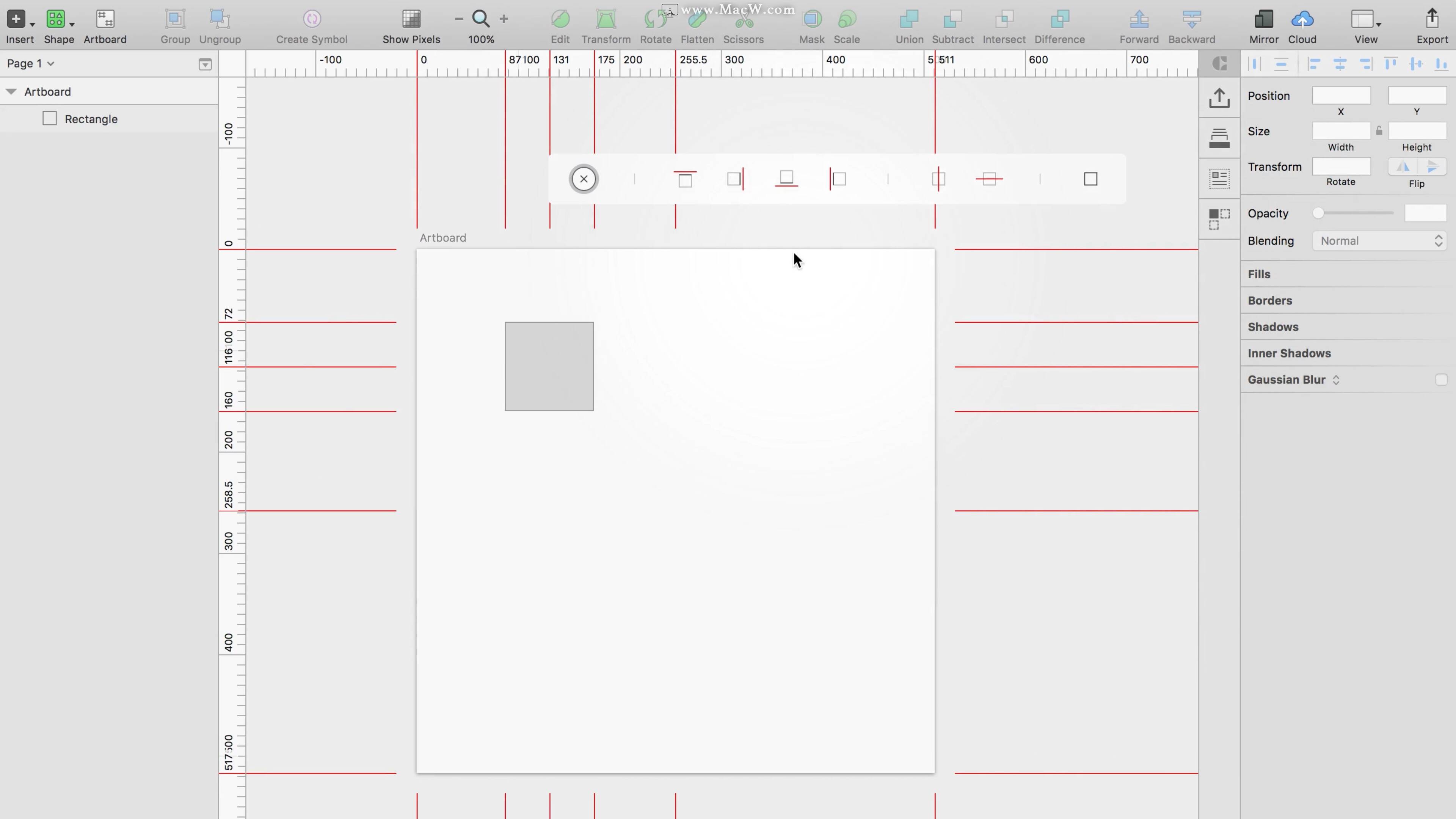 Sketch Guides 拥有自己的单独的 Tool Bar ,使用快捷键 ⌃⇧V 即可打开功能菜单,或者你也可通过 Sketch Runner 来呼出菜单,相当的方便,无需记住更多的快捷键或者去顶栏中去点击功能。