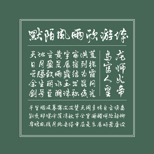默陌风雨欣游体是一款非常不错的电脑毛笔手写中文字体。该字体第一眼看上去非常的飘逸,同时字形的书写非常的行云流水,非常的连贯。俊雅多姿的毛笔手写字体,笔画婉转清丽,字形灵动飘逸,连笔流畅,以圆转见长,对比鲜明,粗细兼具,富有清雅的古典气息。适用于影视广告、海报、个性化排版等多种场景应用。欢迎感兴趣的朋友下载使用。