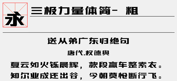 三极力量体简粗字体是一款充满力量的中文印刷字体,该字体整体比较粗黑,字形扁方、结构严谨,笔画粗壮、左右结构有意夸张,富有张力。结构新颖独特、个性刚健有力,给人一种气势雄伟,庄重大方的感觉。可以很好的应用于文本装潢、信息展示、网页设计、篆刻制模、数据制作、装潢设计、计算艺术设计、视觉设计、字帖等一切合法应用场景,有喜欢的朋友可免费下载收藏。