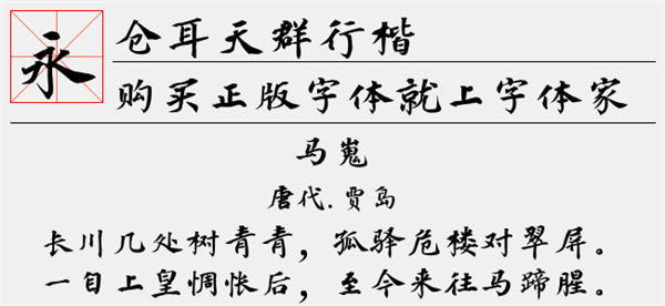 仓耳天群行楷字体是一款让人赏心悦目、百看不厌的中文字体,该字体采用了弧线的创新处理,活泼中略显大气。行楷追求的是简单大气,便利流畅,别具一格的姿态。这款字体把行楷体现的变幻灵动,缩放有效,随意但不失力道。可以应用于文本装潢、信息展示、网页设计、篆刻制模英文、数据制作、装潢设计、计算艺术设计、视觉设计、字帖等一切合法应用场景,有喜欢的朋友可免费下载收藏。