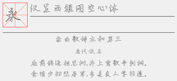 汉呈西雅图空心体是由汉呈字库出品的一款非常漂亮的书法艺术空心字体,这款字体拥有浓重的西雅图特色,更多的飘逸以及独特的艺术设计感。独特的空心字体设计,结合中国独有的书法字体风格,非常有设计感。可以很好的应用于文本装潢、信息展示、网页设计、篆刻制模、数据制作、装潢设计、计算艺术设计、视觉设计、字帖等一切合法应用场景,有喜欢的朋友可免费下载收藏。