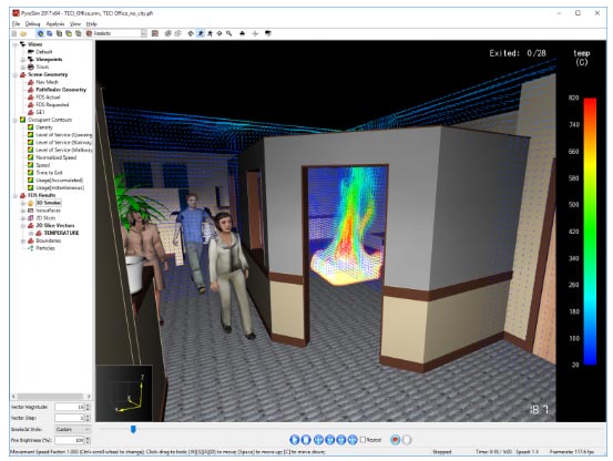 查看烟雾,温度,速度,毒性和FDS分析的其他输出。通过在调整相机和数据可视化的同时进行录制来实时创建视频,或者通过模型设置准备好的视觉导览。可以在NIST提供的Smokeview之间轻松切换,也可以使用与PyroSim具有类似界面的Results Viewer,该界面还可以集成Pathfinder乘员移动结果。