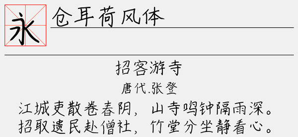 仓耳荷风体字体是一款赏心悦目、百看不厌的中文字体,该字体选用硬笔书写,字形规范、结构端正,其风格较为平正中和,笔画转折都做了圆滑处理,犹如清风带着阵阵荷香,或带着微微荷香的风,具有很好的视觉感。且字库完整,并结构明朗,可以很好的应用于文本装潢、信息展示、网页设计、篆刻制模、数据制作、装潢设计、计算艺术设计、视觉设计、字帖等一切合法应用场景,有喜欢的朋友可免费下载收藏。