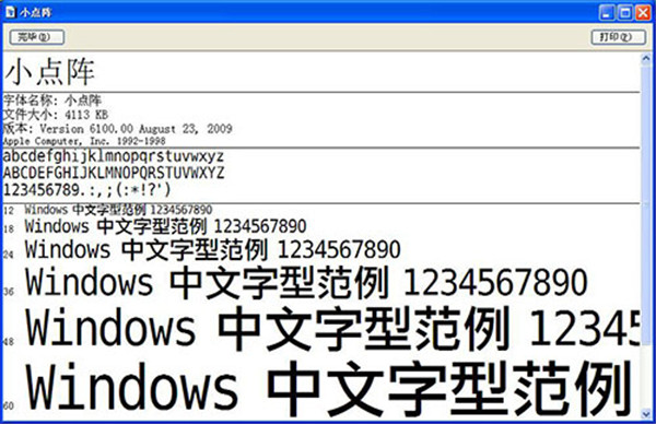 点阵字体是能够每一个字符都分成16×16或24×24个点,然后用每个点的虚实来表示字符的轮廓的字体。其最大的缺点是不能放大,一旦放大后就会发现文字边缘的锯齿。字体发行格式为BDF,号数为12px(11*11像素),内涵26个英文字 母+日文五十音+简体中文+正体中文+常用标点符号。有需要的用户朋友们可以前来下载试试!