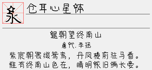 仓耳心星体字体是一款简约可爱的手写字体,这款字体造型新颖,字形工整,可爱风的图案又使字体活泼可爱,呈现出设计构思的精巧,艺术性强,充满青春的味道。字体中使用五角星、心形图案对字体的部分笔画进行替换,结构立体,在其书写时每个汉字都有一个可爱的小图案,使用者会感觉到满满的新奇,打破了传统的死板的字体,突出字体可爱和浪漫的特性。可以很好的应用于文本装潢、信息展示、网页设计、篆刻制模、数据制作、装潢设计、计算艺术设计、视觉设计、字帖等一切合法应用场景,有喜欢的朋友可免费下载收藏。