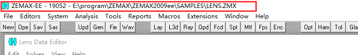 1、标题栏zemax版本——加密狗序列号——当前文件存储路径,如下图