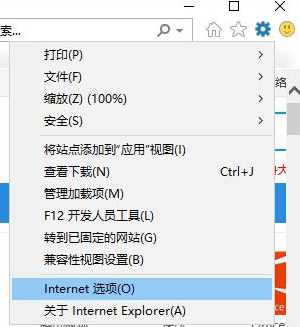1、点击IE浏览器右上角的齿轮图标,打开主菜单,然后在下拉菜单中点击“Internet选项”。
