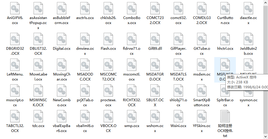 开始---运行---输入regsvr32---你的控件名.ocx中的例子后按确定即可. 不过先要把这个.ocx文件放在c:\windows\system32目录下regsvr32的用法: