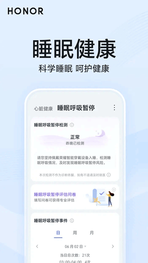 【主动测量】整晚主动连续测量,及时捕捉睡眠呼吸暂停风险。