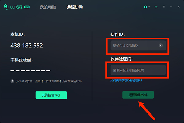 3、控制端将刚刚复制的“伙伴ID”和“伙伴验证码”填写完后,选择下方“远程协助伙伴”选项,即可控制对方电脑了。