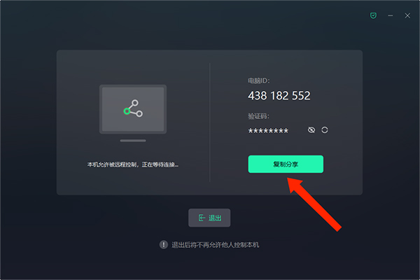 2、出现设备ID和验证码,选择下方“复制分享”选项,发送给对方,