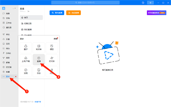 1、打开钉钉电脑版软件,在左边任务栏点击【更多】选项,然后选择【直播】选项,