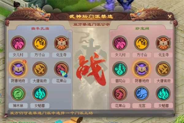 女魃墓、天机城、花果山3个门派循环相克,每个门派都有对应另一个门派的必杀技能,按相互的克制排序为女魃墓→天机城→花果山→女魃墓。
