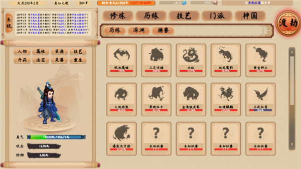 《修仙立志传》通过真气(血量)、攻击、防御三大主属性建立了一个数据核心,在后续的渡劫、挑战、秘境探索中都会通过这三个主要属性来判定战斗结果。