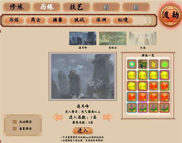 9、渡劫台。培养100个主力,境界与手下最强持平即可,其他的按部就班慢慢挂着渡劫。