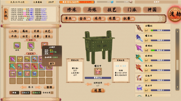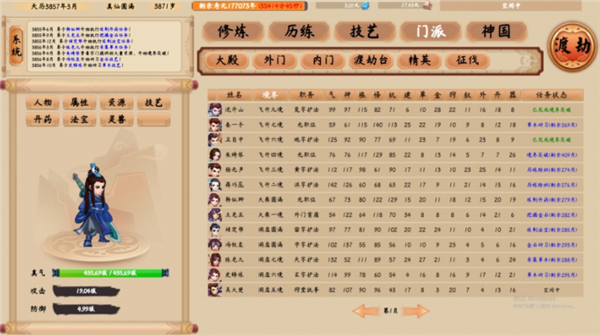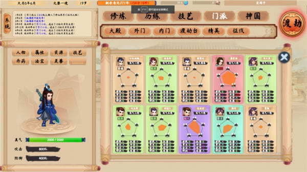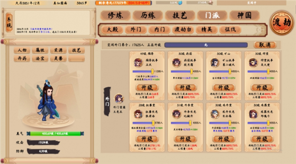 游戏进入中期后,就可以建立自己的宗门了。虽然是点击进度条的简单操作方式,但各种管理元素可用于招募不同的人才,收集发展资源,建造宗派设施,征服世界。