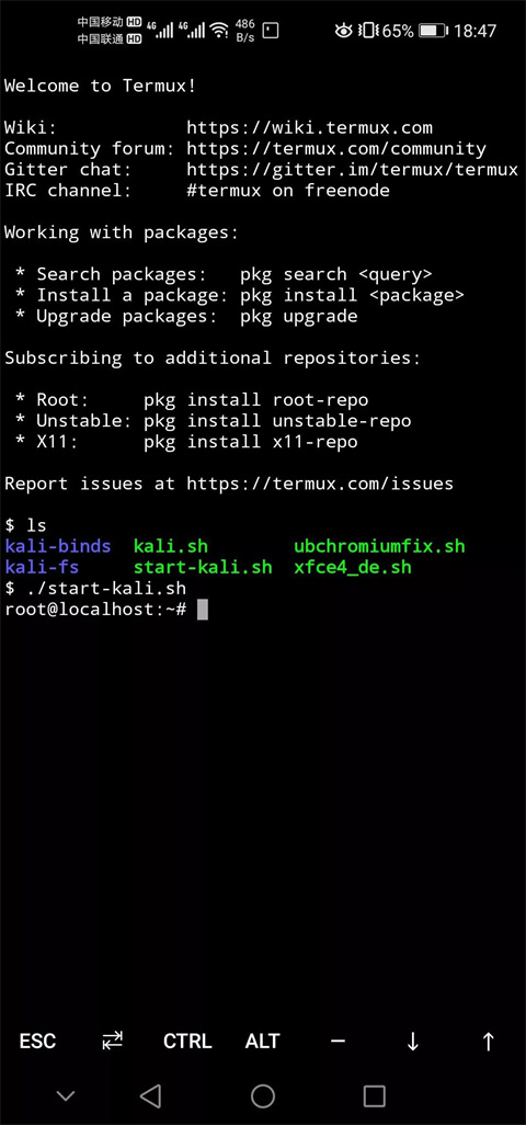 7、目录下的 start-kali.sh 文件就是我们安装的 Kali 系统的启动文件,所以我们输入命令 ./start-kali.sh 启动系统:
