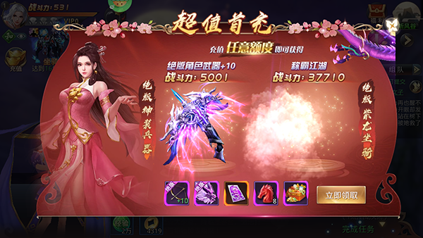 2、然后内置超强首充礼包,赠送绝版神器和坐骑。