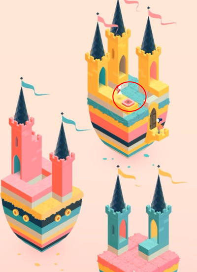 本章节的设计较为独特,玩家先控制粉色建筑下来,然后转动它,使得萝尔母女可以站到它上面。接到人后,就再次移动它,将小人们送到门处。第二个场景有许多传送门,玩家可以转动左侧传送门于下图这个位置,让女儿可以通过它来到萝尔身旁,并按下按钮,再次转动此建筑,让女儿去按另一个按钮,移动下面的建筑,母女二人即可先后进门。