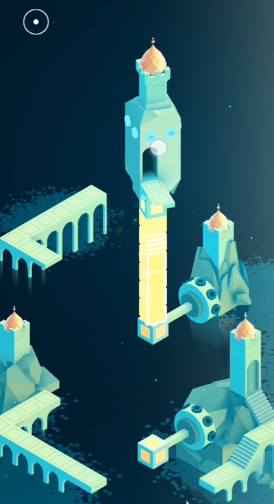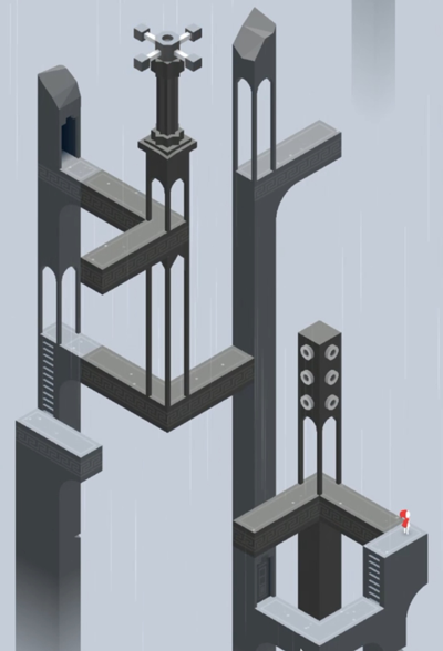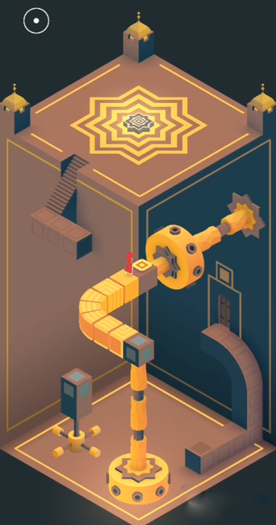 场景三先将建筑转成下图这个样子,接着进入传送门,小人会从中间一层的门出来,再次旋转建筑,组成楼梯,使小人可以向上攀登,最后三次旋转可以带领小人进入最终的门啦!场景四中的凸弧形墙与凹弧形墙都是可移动的,先利用凸墙移动到前侧灰色按钮处,再到另一个按钮处,图腾出现,本章完结。