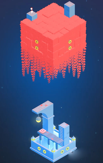 首先让萝尔母女一直通过梯子爬到建筑的最顶层,接着二人分别按下两个按钮,让门出现,然后进入门中,场景转换。第二个场景只有萝尔一人,向右转动建筑,让萝尔去靠近发光的小人,进入下一场景。第三个场景,利用移动板来让二人到达断层的另一端,女儿按到的粉红色按钮,会让建筑升起,搭起一段路,此时先让女儿去按远处的粉红色按钮,接着萝尔进门,再让女儿按左边的粉红色按钮,萝尔则去按住圆形浅黄色按钮,同时转动圆柱,使女儿能够来到萝尔这里,二人共同进门。