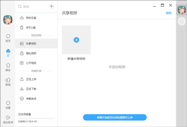 4、登录后进入软件如图,用户可与好友聊天,共享相册、上传文件等。