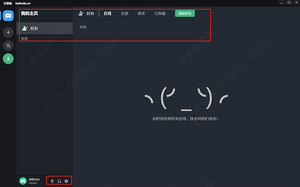 7、在我的主页中,可看到自己在线和全部的好友,也能看到好友请求、已屏蔽、私信等信息,下面是麦、耳机、设置等功能;